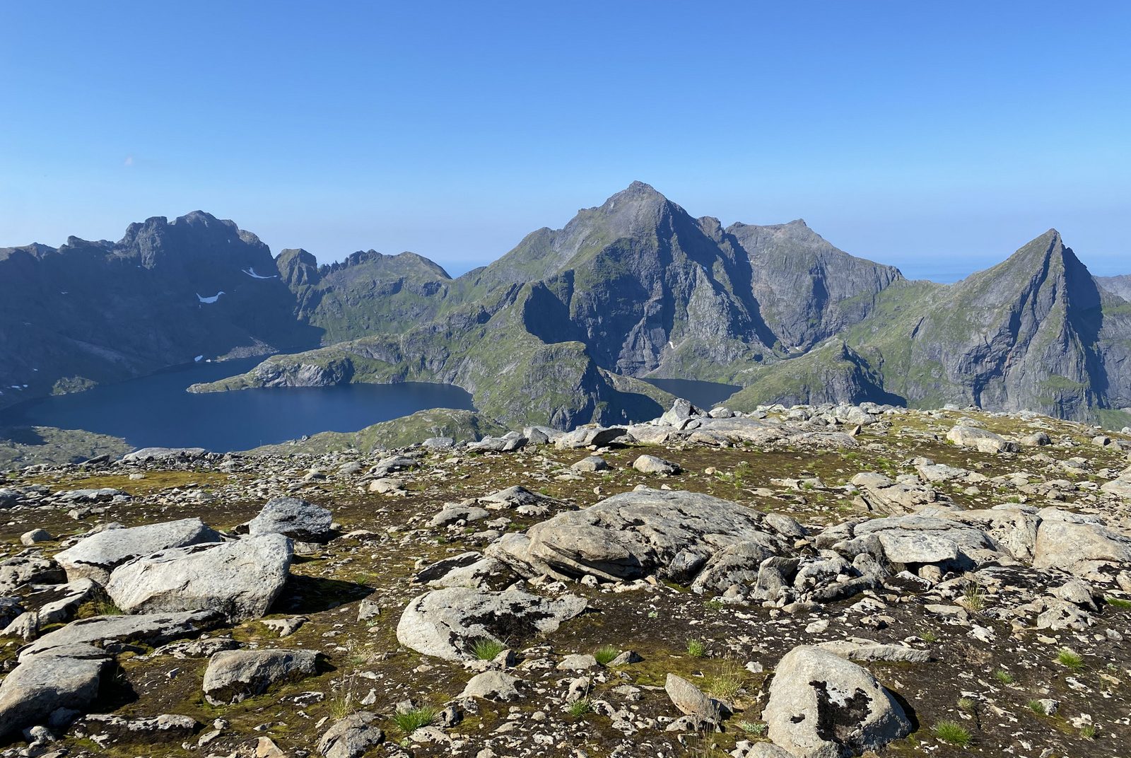 Full size 1600 × 1072 pixels Lofoten, Norge Ten najwyższy szczyt po środku, to faktycznie najwyższy szczyt Lofotów: Hermannsdalstinden 1029 m. Szpic po prawej to Brynliskartinden 787 m. Rozległy najbardziej po lewej stronie: Ertenhelltinden 940 m. Previous image Next image